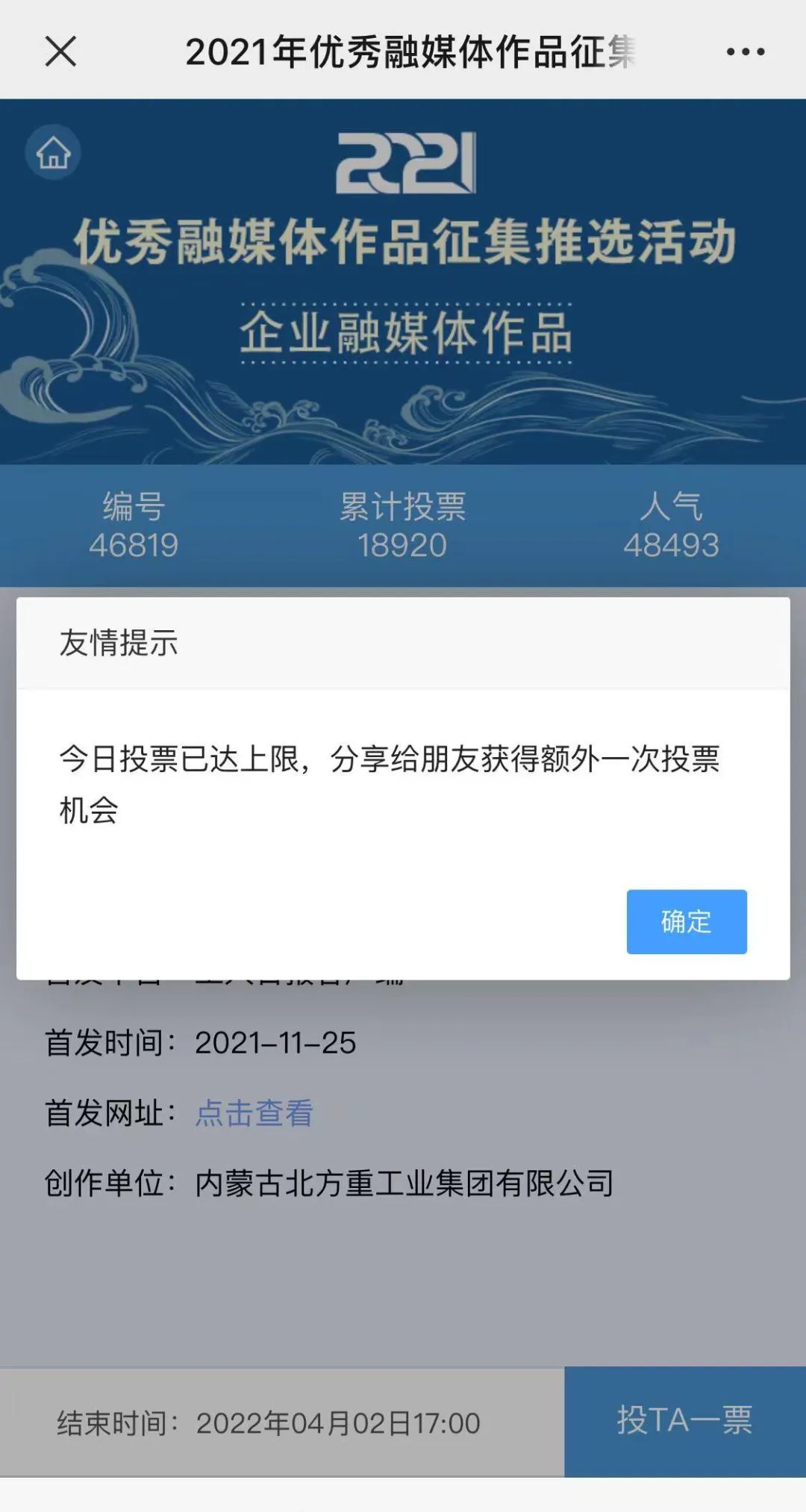 近日,由“文化強國”光明日報協(xié)同推廣平臺、光明網(wǎng)、北京師范大學(xué)新媒體傳播研究中心和光明天翼5G融媒實驗室共同主辦的“2021年優(yōu)秀融媒體作品征集推選活動”開啟線上投票環(huán)節(jié),經(jīng)過專家委員會評審,中國兵器工業(yè)集團北重集團《白楊伴我獻國防》音樂MV入選活動前二十名,并進入網(wǎng)絡(luò)投票環(huán)節(jié)。 《白楊伴我獻國防》 楊樹參天 高聳云端的是兵工人 “履行好強軍首責(zé)”的壯志凌云! 深植北疆 傾獻沃土的是北重人 “推動高質(zhì)量發(fā)展”的壯志豪情! 白楊樹伴著我們茁壯成長 見證著我們獻身國防! 投票方式 1.掃描下方二維碼,進入初始界面,點擊“企業(yè)融媒體作品征集”,進入投票界面點擊《白楊伴我獻國防》,點擊“投TA一票”; 2. 每人每日可投10票,直至提示投票達到上限即可; 3.投票時間:2022年3月17日09:00-2022年4月2日17:00。 來源/光明網(wǎng)、北重集團 |
