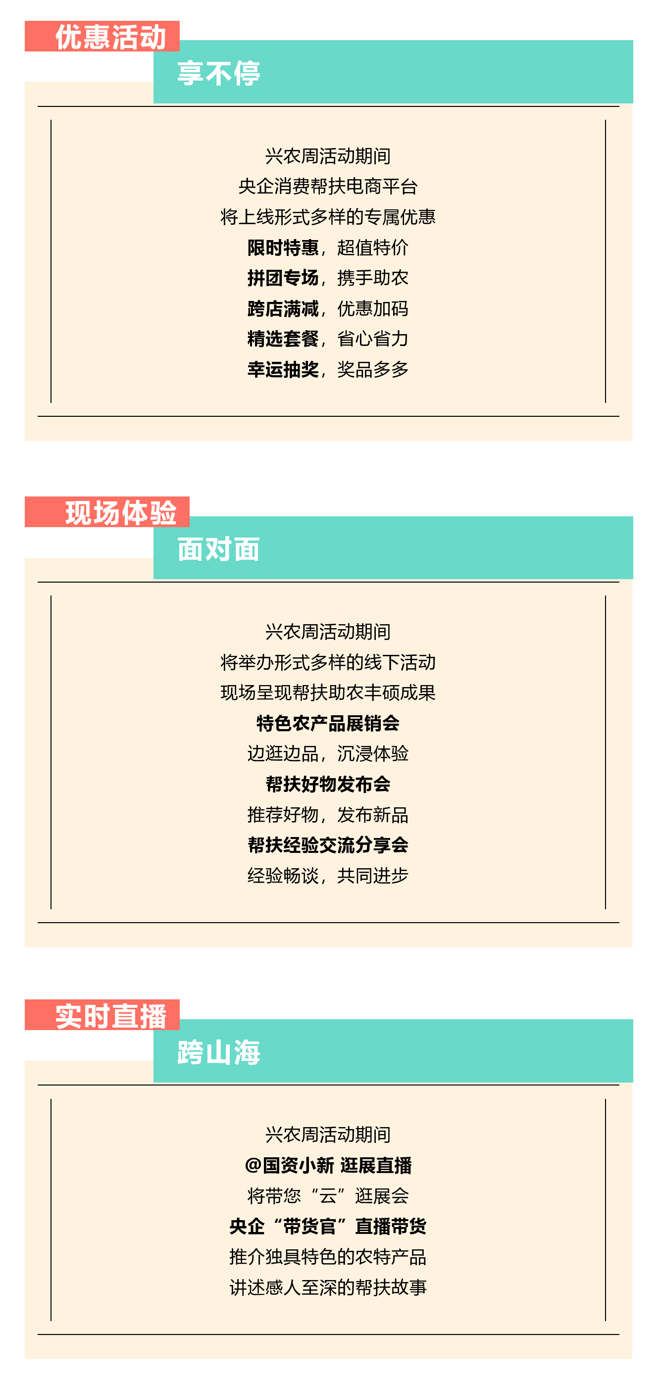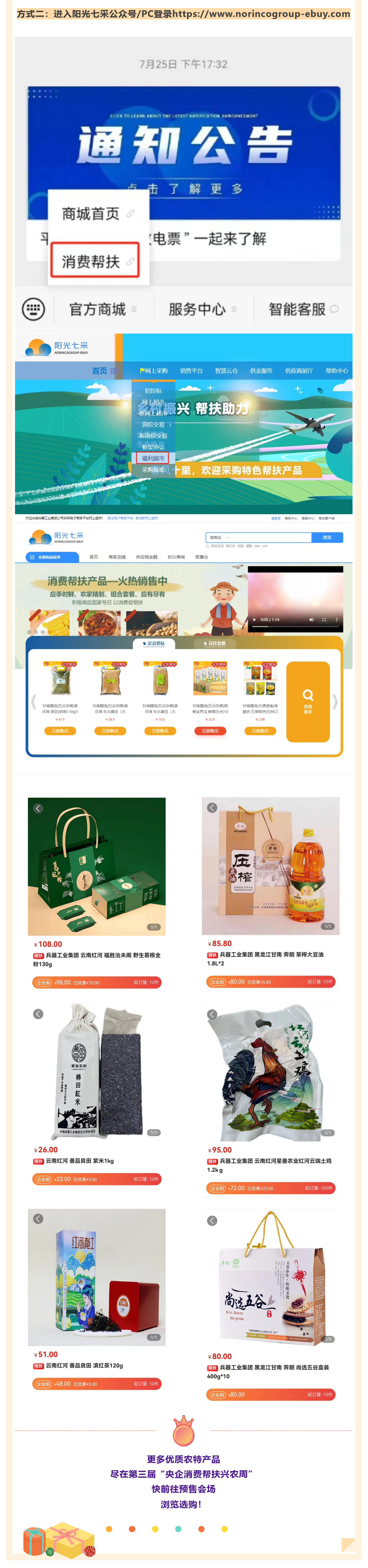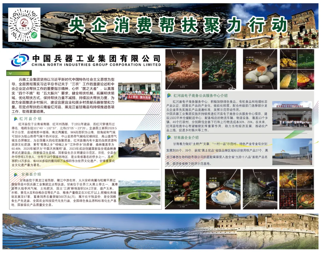 百家央企聚合力 消費幫扶促振興 第三屆“央企消費幫扶興農周” 預售已啟動 8月30日 興農周活動將正式開啟 “央企消費幫扶興農周”由國務院國資委社會責任局指導,央企消費幫扶電商平臺(國網數字科技控股有限公司)主辦,國務院國資委機關服務管理局、國務院國資委新聞中心、國網北京市電力公司、各中央企業(yè)電商平臺聯(lián)合協(xié)辦。 活動以“央企攜手,興農惠民”為主題,組織動員中央企業(yè)所屬各單位各部門(特別是工會、食堂)、廣大干部職工、上下游供應商和業(yè)務合作伙伴采購幫扶縣的優(yōu)質農產品,促進脫貧地區(qū)產業(yè)發(fā)展和脫貧群眾穩(wěn)定增收,鞏固拓展脫貧攻堅成果。 預售活動火熱開啟 為方便大家提前選購 此次預售期升級為10天 (8月20日-8月29日) 誠邀下單 兵器工業(yè)集團定點幫扶 黑龍江甘南縣、云南紅河縣 農特產品! 8月30日-9月5日 請鎖定“央企館-兵器工業(yè)集團” 我們一起共譜鄉(xiāng)村振興新篇章! |