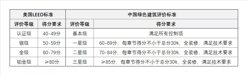 中國綠色建筑評價標準、美國LEED標準根據項目獲得的分數來劃定綠色建筑等級,從低到高,中國綠色建筑評價標準:基本級、一星級、二星級、三星級,美國LEED標準:認證級、銀級、金級、鉑金級。