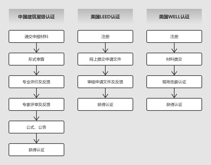 在證書有效期方面,中國綠色建筑評價標準星級認證分為“設計標識”和“運行標識”,“設計標識”有效期2年,“運行標識”有效期3年,美國WELL認證有效期也為3年;認證證書到期后需要重新申請認證。美國LEED認證為終身有效(LEED EB除外)。
