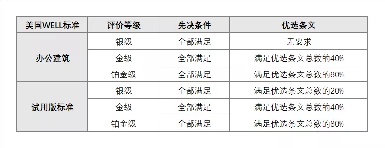 美國WELL建筑標準評價等級的劃分與前兩者不同,是通過判斷滿足的條款數量來劃分等級,分為:銀級、金級、鉑金級。