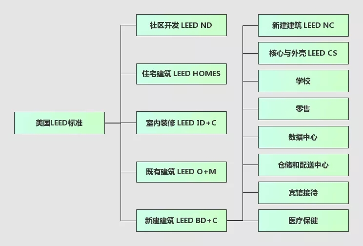 美國LEED標準分為5大類,分別為:新建建筑設計及施工(LEED BD+C)、既有建筑運營及維護(LEED O+M)、室內裝修設計及施工(LEED ID+C)、住宅建筑(LEED HOMES)、社區(qū)開發(fā)(LEED ND)。其中LEED BD+C又可細分出新建建筑(LEED NC)、核心與外殼(LEED CS)、學校、零售、數據中心等等。